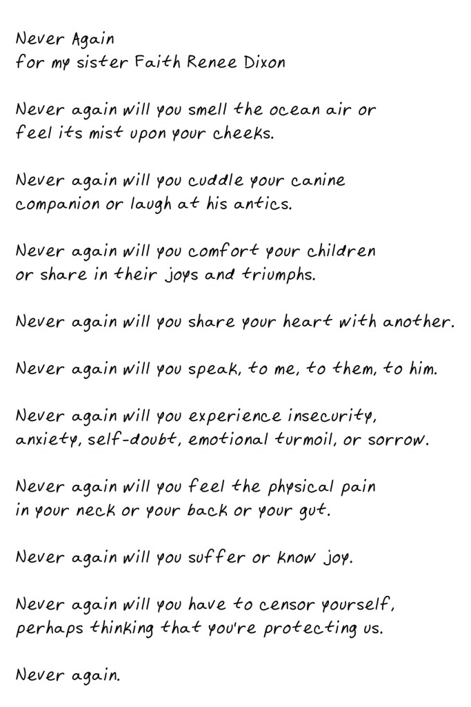 I still attended my weekly recovery meetings and I shared in a general way how I was feeling and what I was going through. I also sought out others I might be able to speak with about our shared grief, others who had lost loved ones, particularly siblings, to suicide. I felt more alone, not being able to find a sibling group during that first year. I tried some message board pages where you type out your feelings, but that felt flat, like I wasn’t being heard. I wrote a poem to her, about her. I did my best to be available to my father and to her daughters, my nieces, but it was hard going.